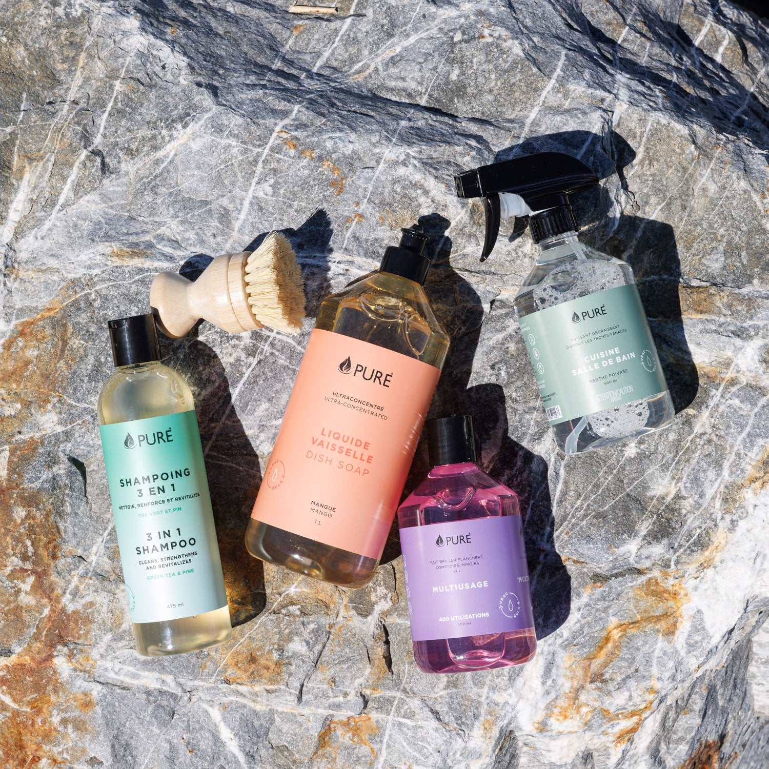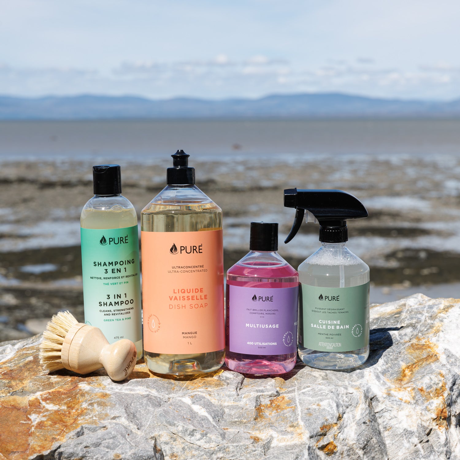 L’ensemble parfait pour être écoresponsable, même dans le bois, loin du confort de la maison! Les produits Pure offrent une grande polyvalence dans leur usage. Si vous partez tout l’été dans les campings du Québec et que vous avez peur d’en manquer, pas de problème! Visitez notre section points de vente afin de trouver la station de remplissage la plus près.