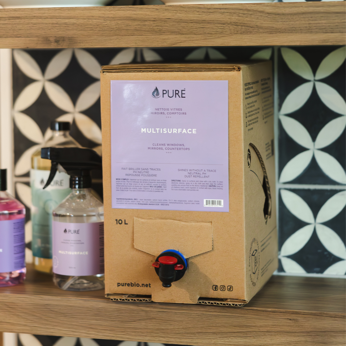 La boite 10L est écoconçue : faites de carton recyclé, ce format représente 90% moins de plastique et permet de réduire ses gaz à effet de serre. Peut recharger 20 fois ta bouteille de multisurface. Pure, une bouteille pour la vie.