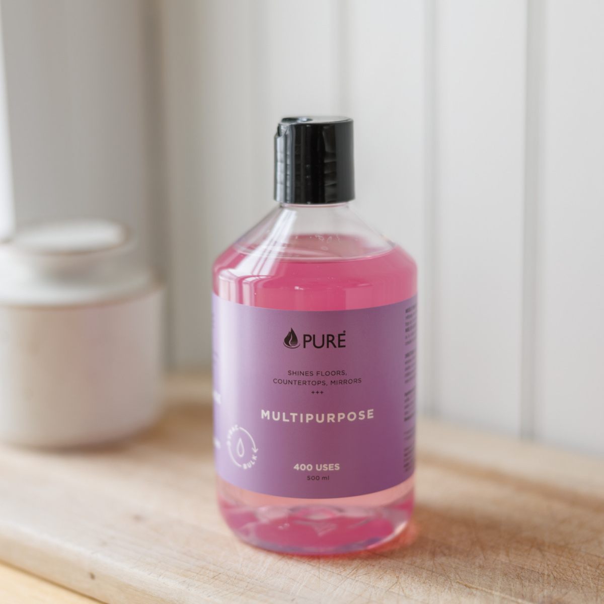 À base d’ingrédients naturels comme l’eau de rose, le multiusage ultraconcentré affiche une redoutable efficacité, tant à l’intérieur qu’à l’extérieur de la maison! Reconnu sous le nom du produit rose, il est un essentiel dans une maison! La liste est longue de tout ce que le multiusage peut laver : plancher, vitre, comptoir, escalier, déco, auto, bateau, kayak, paddleboard, etc!